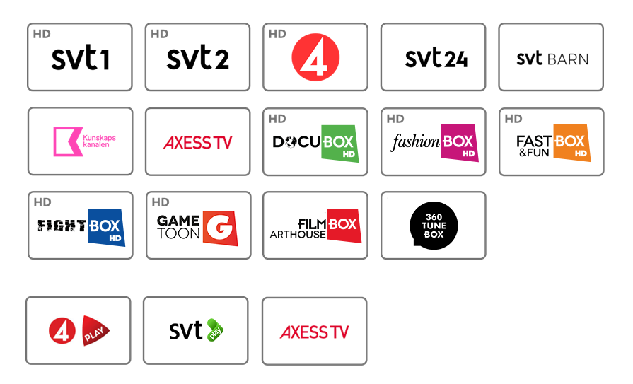 SVT1, SVT2, SVT24, SVT Barn/Kunskapskanalen, TV4, Axess TV, DocuBox, FashionBox, Fast&FunBox, FightBox, GameToon, FilmBox Arthouse och 36o TuneBox. Samt Play-biblioteken SVT och TV4 Play.